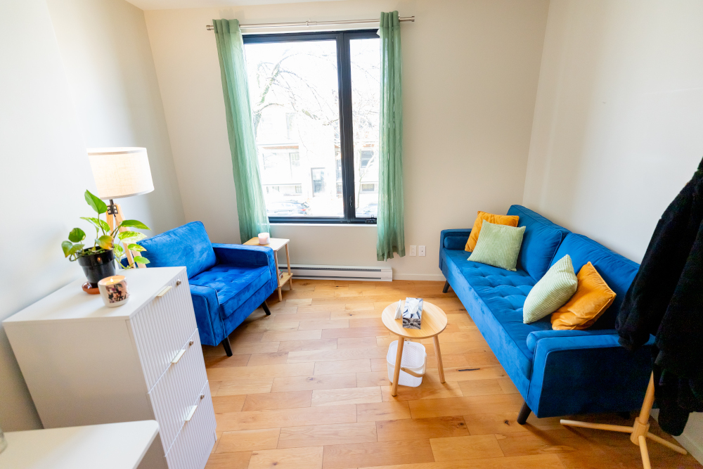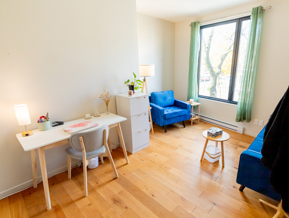 Je travaille uniquement en présentiel, à mon bureau situé au 6415 12e avenue à Montréal (quartier Rosemont).